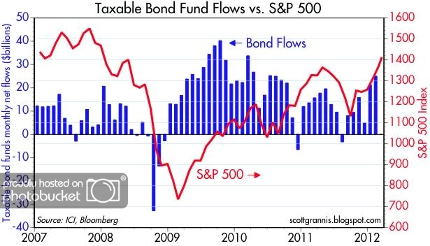 Mr. Grannis includes some charts that show both the rapid growth of savings deposits and the strong investor preference for bonds over stocks right now. We regularly detail the ICI numbers here as well, but his charts are a fantastic visual presentation.