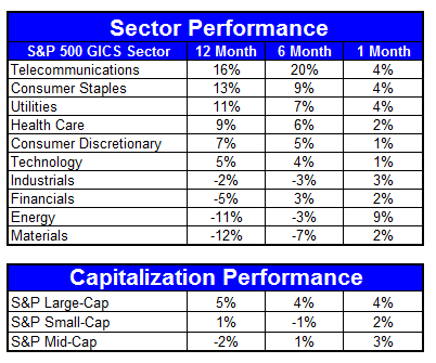 The chart below shows performance of US sectors and capitalizations over the trailing 12, 6, and 1 month(s). Performance updated through 7/26/2012.