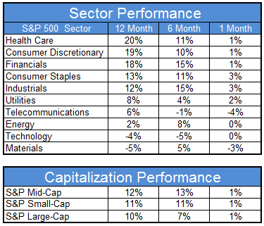 The chart below shows performance of US sectors and capitalizations over the trailing 12, 6, and 1 month(s). Performance updated through 2/28/2013.