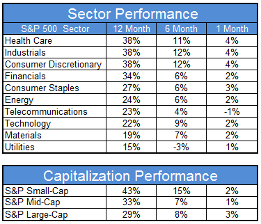 The chart below shows performance of US sectors and capitalizations over the trailing 12, 6, and 1 month(s). Performance updated through 11/21/2013.