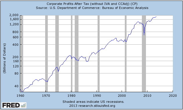Since this chart is done on a logarithmic scale, it suggests that corporate profits are rising at a pretty steady constant percentage rate. I’m sure the composition of corporate profits has changed—which companies are producing them—over time, but American business seems to be remarkably resilient.