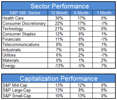 The chart below shows performance of US sectors over the trailing 12, 6, and 1 month(s). Performance updated through 4/23/15.