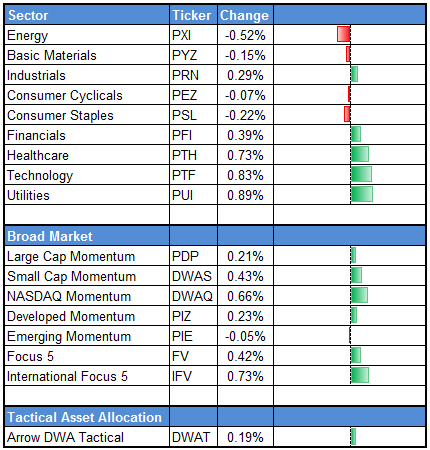 The performance above is based on pure price returns, not inclusive of dividends or all transaction costs. Past performance is not indicative of future results. Potential for profits is accompanied by possibility of loss. The relative strength strategy is NOT a guarantee. There may be times where all investments and strategies are unfavorable and depreciate in value. Nothing contained herein should be construed as an offer to sell or the solicitation of an offer to buy any security. This post does not attempt to examine all the facts and circumstances which may be relevant to any product or security mentioned herein. We are not soliciting any action based on this post. It is for the general information of readers of this blog. This post does not constitute a personal recommendation or take into account the particular investment objectives, financial situations, or needs of individual clients. Before acting on any analysis, advice or recommendation in this post, investors should consider whether the security or strategy in question is suitable for their particular circumstances and, if necessary, seek professional advice. Dorsey Wright & Associates is the index provider for the above ETFs.