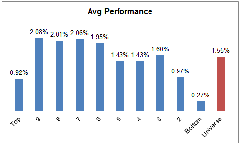 The table below shows the performance of a universe of mid and large cap U.S. equities, broken down by relative strength decile and then compared to the universe return. Those at the top of the ranks are those stocks which have the best intermediate-term relative strength. Relative strength strategies buy securities that have strong intermediate-term relative strength and hold them as long as they remain strong.