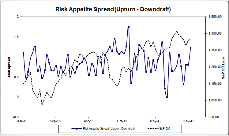 Chart 7: Risk Appetite Spread. This is a chart constructed from the data in Chart 6, where the average risk appetite of the downdraft group is subtracted from the average risk appetite of the missing upturn group. The spread moved higher this round.