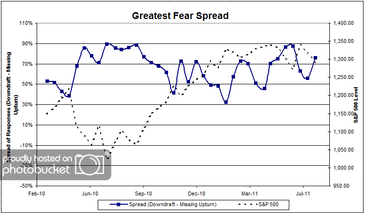 This survey, we saw a relatively minor market rally, and small moves in both the overall fear numbers and the average risk appetite. The overall fear numbers actually got worse this round, despite a rally. On the other hand, the risk appetite average number nudged higher, in line with the market. The overall risk appetite number remains the king of all indicators, performing as expected nearly every survey round. On the whole, client sentiment is still very, very bad, especially when considering the S&P has rallied nearly 10% in less than two months.