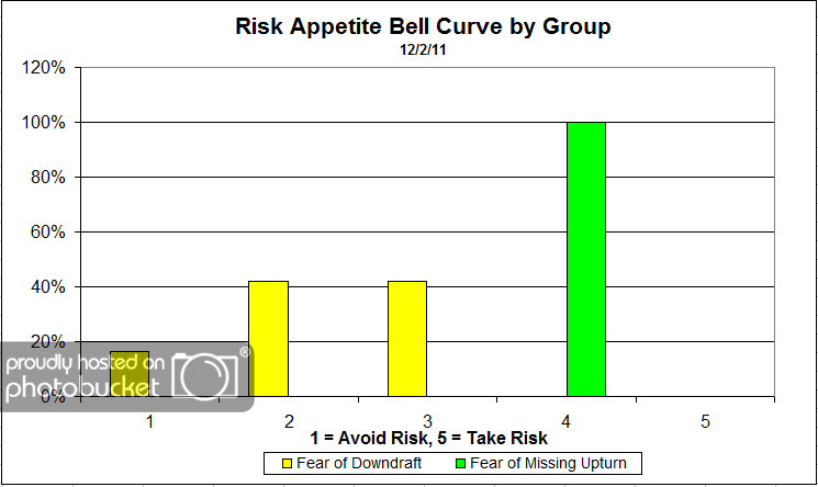 Our latest sentiment survey was open from 11/4/11 to 11/11/11. The Dorsey, Wright Polo Shirt Raffle continues to drive advisor participation, and we greatly appreciate your support! This round, we had 86 advisors participate in the survey. If you believe, as we do, that markets are driven by supply and demand, client behavior is important. We’re not asking what you think of the market—since most of our blog readers are financial advisors, we’re asking instead about the behavior of your clients. Then we’re aggregating responses exclusively for our readership. Your privacy will not be compromised in any way.