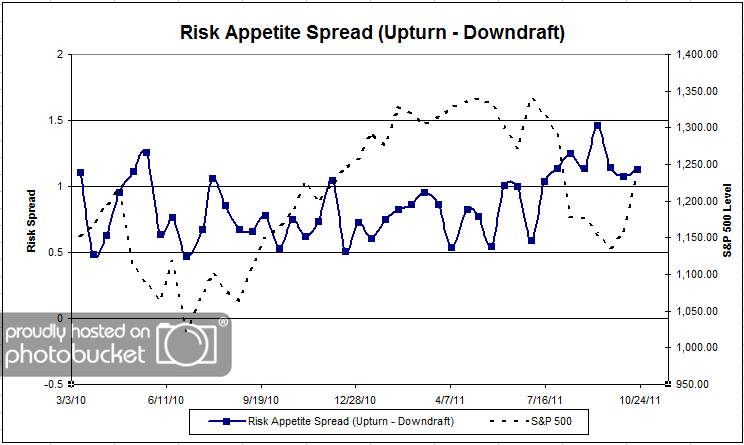 Chart 7: Risk Appetite Spread. This is a spread chart constructed from the data in Chart 6, where the average risk appetite of the downdraft group is subtracted from the average risk appetite of the missing upturn group. The spread fell slightly this round.