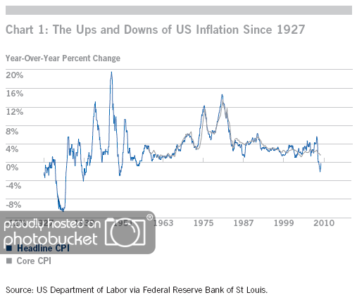 After many years of being a minor concern for US investors, inflation worries have again assumed a more prominent position in the investment landscape. While core inflation has remained muted, headline figures have been whipsawed by dramatic movements in energy prices, and the outlook has been clouded by countervailing pressures from the deep recession on the one hand and the government’s massive stimulus measures and the resulting extraordinarily high deficits on the other hand. These forces threaten to trigger a shift from the benign inflation regime enjoyed over the past roughly 25 years in the U.S. to something more like the volatile earlier experience shown in Chart 1.