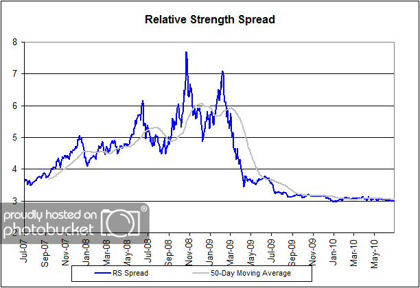 The chart below is the spread between the relative strength leaders and relative strength laggards (universe of mid and large cap stocks). When the chart is rising, relative strength leaders are performing better than relative strength laggards. As of 7/26/2010: