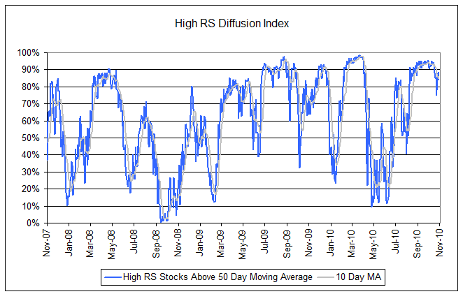 The chart below measures the percentage of high relative strength stocks that are trading above their 50-day moving average (universe of mid and large cap stocks.) As of 11/23/10.