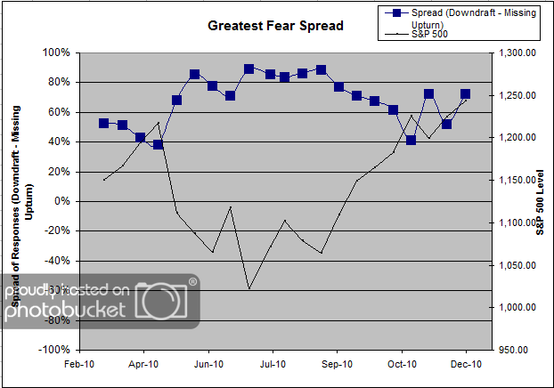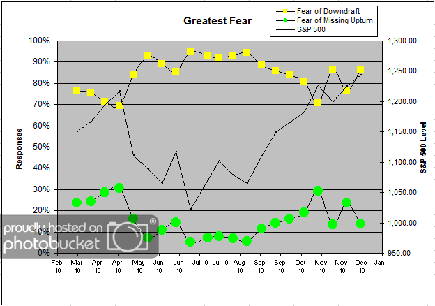 Our latest sentiment survey was open from 12/17/10 to 12/24/10. The survey continues to experience a “holiday malaise,” with only 72 particpants responding. Things will surely pick up once the new year gets rolling. Your input is for a good cause! If you believe, as we do, that markets are driven by supply and demand, client behavior is important. We’re not asking what you think of the market—since most of our blog readers are financial advisors, we’re asking instead about the behavior of your clients. Then we’re aggregating responses exclusively for our readership. Your privacy will not be compromised in any way.