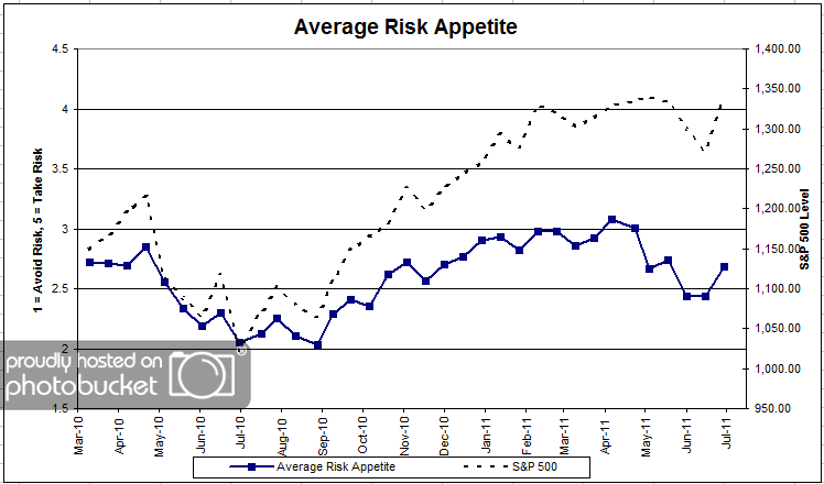 Chart 3: Average Risk Appetite. Average risk moved higher from survey to survey, from 2.44 to 2.68. Clients normally respond to recent activity in the market, and since the market was up over 5% since the last survey, the increase in risk appetite is not a big surprise. One positive: clients did not go off the deep end this summer during the correction like they did last summer. Last year, average risk appetite dropped as low as 2.03 during the worst client pessimism. This summer it reached only 2.44.