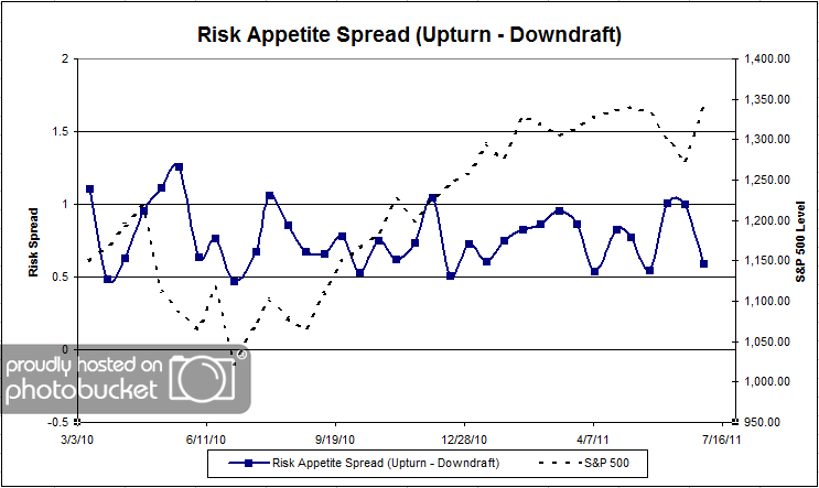Chart 7: Risk Appetite Spread. This is a spread chart constructed from the data in Chart 6, where the average risk appetite of the downdraft group is subtracted from the average risk appetite of the missing upturn group. The spread took a pronounced drop this week, although it’s still in the 0.5 to 1.0 range where it has stayed most of the past couple of years.