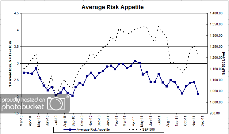 Chart 3: Average Risk Appetite. Overall risk numbers plummeted this round, from 2.44 to 2.08. Overall risk appetite is now the lowest we’ve seen since September of 2010.
