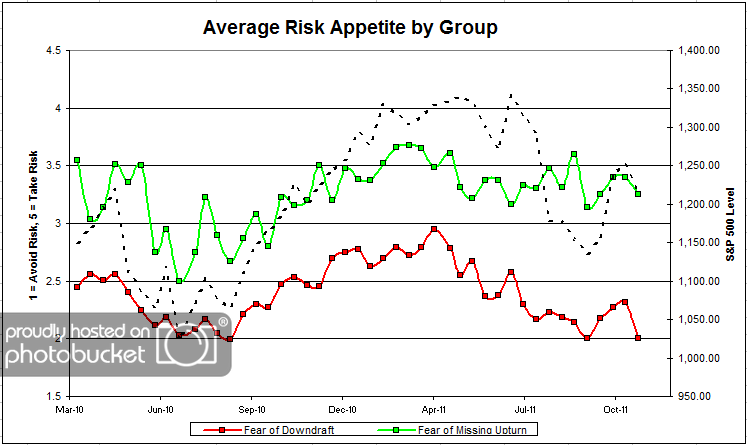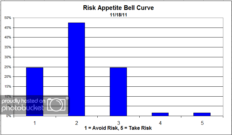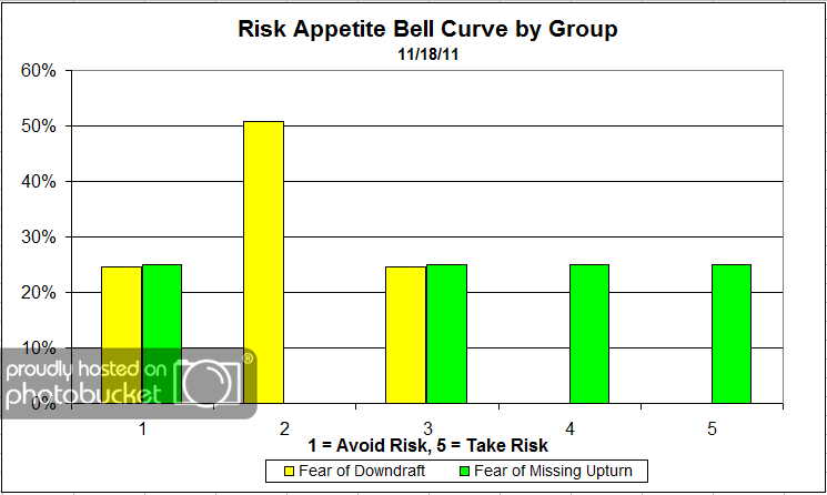 Our latest sentiment survey was open from 11/18/11 to 11/25/11. The Dorsey, Wright Polo Shirt Raffle continues to drive advisor participation, and we greatly appreciate your support! This round, we had 61 advisors participate in the survey (holiday week = light traffic). If you believe, as we do, that markets are driven by supply and demand, client behavior is important. We’re not asking what you think of the market—since most of our blog readers are financial advisors, we’re asking instead about the behavior of your clients. Then we’re aggregating responses exclusively for our readership. Your privacy will not be compromised in any way.