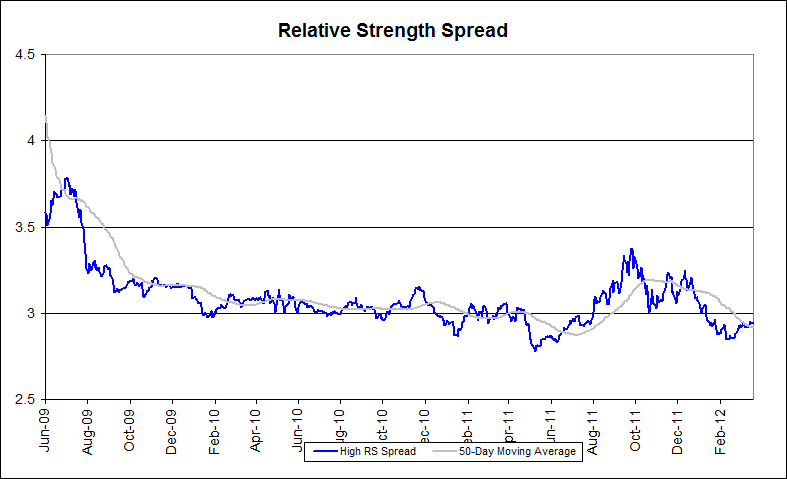 Our latest sentiment survey was open from 3/16/12 to 3/23/12. The Dorsey, Wright Polo Shirt Raffle continues to drive advisor participation, and we greatly appreciate your support! This round, we had 45 advisors participate in the survey. If you believe, as we do, that markets are driven by supply and demand, client behavior is important. We’re not asking what you think of the market—since most of our blog readers are financial advisors, we’re asking instead about the behavior of your clients. Then we’re aggregating responses exclusively for our readership. Your privacy will not be compromised in any way.