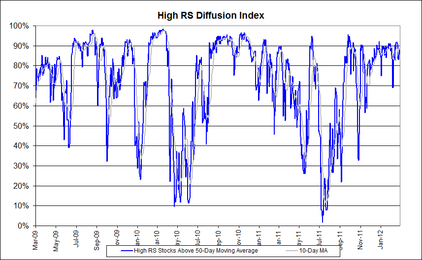 The chart below measures the percentage of high relative strength stocks that are trading above their 50-day moving average (universe of mid and large cap stocks.) As of 3/20/12.