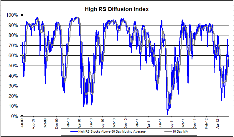 The chart below measures the percentage of high relative strength stocks that are trading above their 50-day moving average (universe of mid and large cap stocks.) As of 6/19/12.
