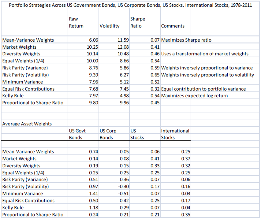 That’s a lot to absorb. If we remove the academic flourishes, what he is saying is that mean variance optimization is dreadful and is easily outperformed by simply equal-weighting the asset classes. He references Table 14 of his paper, which I have reproduced below.