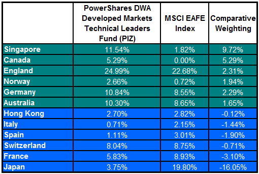 PowerShares DWA Developed Markets Technical Leaders Portfolio (NYSE: PIZ) PIZ is the developed markets equivalent of the popular PowerShares DWA Emerging Markets Technical Leaders Portfolio (NYSE: PIE).