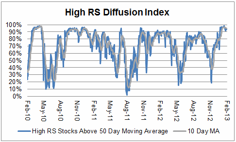 The chart below measures the percentage of high relative strength stocks that are trading above their 50-day moving average (universe of mid and large cap stocks.) As of 2/5/13.