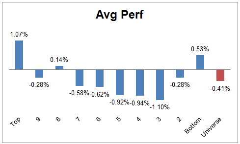 The table below shows the performance of a universe of mid and large cap U.S. equities, broken down by relative strength decile and quartile and then compared to the universe return. Those at the top of the ranks are those stocks which have the best intermediate-term relative strength. Relative strength strategies buy securities that have strong intermediate-term relative strength and hold them as long as they remain strong.