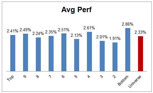 The table below shows the performance of a universe of mid and large cap U.S. equities, broken down by relative strength decile and then compared to the universe return. Those at the top of the ranks are those stocks which have the best intermediate-term relative strength. Relative strength strategies buy securities that have strong intermediate-term relative strength and hold them as long as they remain strong.