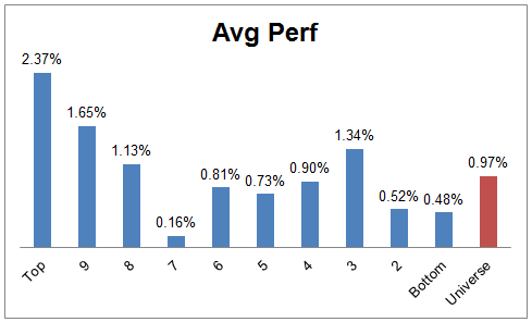 The table below shows the performance of a universe of mid and large cap U.S. equities, broken down by relative strength decile and then compared to the universe return. Those at the top of the ranks are those stocks which have the best intermediate-term relative strength. Relative strength strategies buy securities that have strong intermediate-term relative strength and hold them as long as they remain strong.