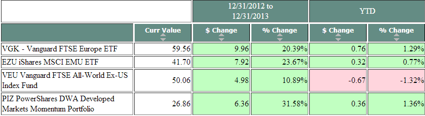 My emphasis added. All three of the ETFs referenced above are cap-weighted ETFs. To those three, I have added the PowerShares DWA Developed Markets Momentum ETF (PIZ), which had better performance in 2013 and is also ahead of those three so far in 2014: