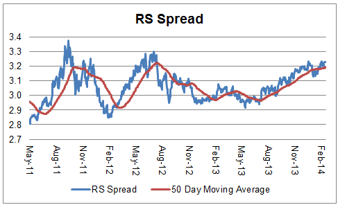The chart below is the spread between the relative strength leaders and relative strength laggards (universe of mid and large cap stocks). When the chart is rising, relative strength leaders are performing better than relative strength laggards. As of 3/10/2014: