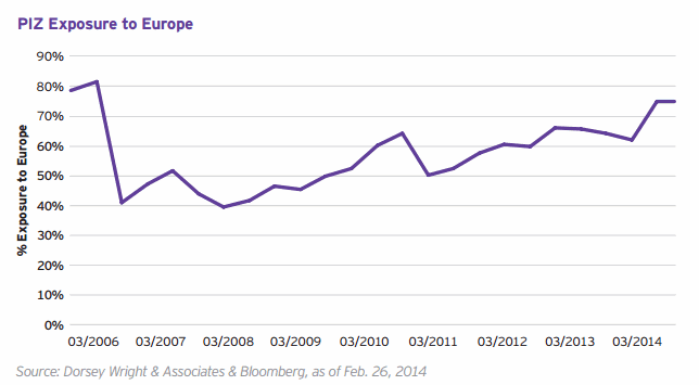 Exposure to Europe in the PowerShares DWA Developed Markets Momentum ETF (PIZ) has increased over the last couple of years.