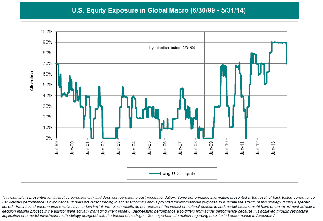 Meanwhile, U.S. equity exposure in our Global Macro portfolio has been on the rise in recent years. This global tactical asset allocation fund is driven by relative strength and as a result it dispassionately overweights those asset classes demonstrating the best performance.