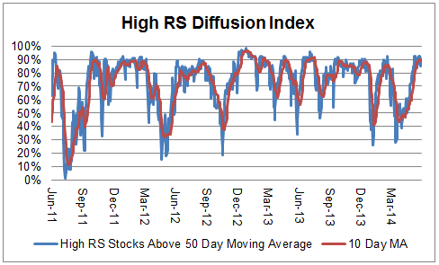 The chart below measures the percentage of high relative strength stocks that are trading above their 50-day moving average (universe of mid and large cap stocks.) As of 6/25/14.
