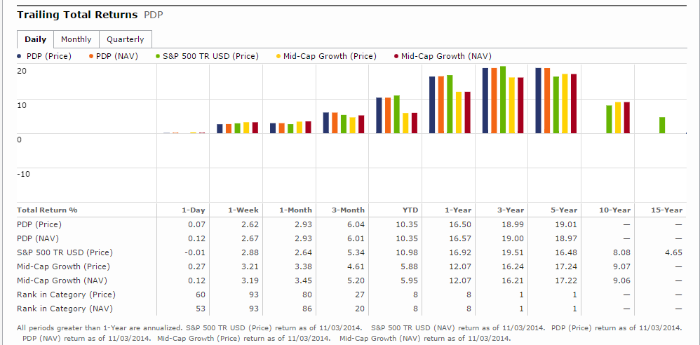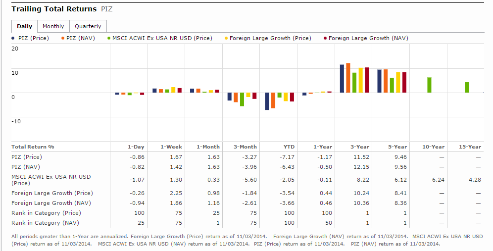 PDP (PowerShares DWA Momentum ETF), PIZ (PowerShares DWA Developed Markets Momentum ETF), and PIE (PowerShares DWA Emerging Markets Momentum ETF) are all the top performing strategies in their Morningstar category over the past 5 years. PDP and PIZ are also the top performing strategy in their category over the last 3 years, and PIE is in the top quintile.