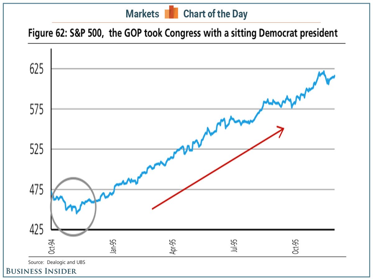 Tuesday was election day and now we know the results—the GOP has taken the Senate. The last time there was a Democrat in the White House and the Republicans were in control of Congress it was followed by quite a run in the stock market. From Business Insider: