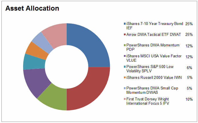 - 25% in a Global Tactical Asset Allocation strategy that uses relative strength to dynamically allocate among U.S. equities, International Equities, Inverse Equities, Currencies, Commodities, Fixed Income, and Real Estate