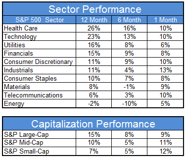 The chart below shows performance of US sectors over the trailing 12, 6, and 1 month(s). Performance updated through 11/13/14.