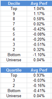 The table below shows the performance of a universe of mid and large cap U.S. equities, broken down by relative strength decile and quartile and then compared to the universe return. Those at the top of the ranks are those stocks which have the best intermediate-term relative strength. Relative strength strategies buy securities that have strong intermediate-term relative strength and hold them as long as they remain strong.