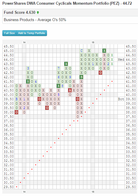 PEZ: Prior to fund inception date (10/12/06), chart is created using extrapolated index data (EZZK), and the fund tracked this index through 2/18/14. Effective 2/19/14, the fund changed the index that it tracks to DWA Consumer Cyclicals Technical Leaders Index (TLCONCYC)