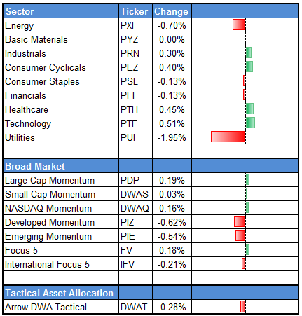 The performance above is based on pure price returns, not inclusive of dividends or all transaction costs. Past performance is not indicative of future results. Potential for profits is accompanied by possibility of loss. The relative strength strategy is NOT a guarantee. There may be times where all investments and strategies are unfavorable and depreciate in value. Nothing contained herein should be construed as an offer to sell or the solicitation of an offer to buy any security. This post does not attempt to examine all the facts and circumstances which may be relevant to any product or security mentioned herein. We are not soliciting any action based on this post. It is for the general information of readers of this blog. This post does not constitute a personal recommendation or take into account the particular investment objectives, financial situations, or needs of individual clients. Before acting on any analysis, advice or recommendation in this post, investors should consider whether the security or strategy in question is suitable for their particular circumstances and, if necessary, seek professional advice. Dorsey Wright & Associates is the index provider for the above ETFs.