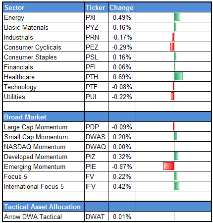 The performance above is based on pure price returns, not inclusive of dividends or all transaction costs. Past performance is not indicative of future results. Potential for profits is accompanied by possibility of loss. The relative strength strategy is NOT a guarantee. There may be times where all investments and strategies are unfavorable and depreciate in value. Nothing contained herein should be construed as an offer to sell or the solicitation of an offer to buy any security. This post does not attempt to examine all the facts and circumstances which may be relevant to any product or security mentioned herein. We are not soliciting any action based on this post. It is for the general information of readers of this blog. This post does not constitute a personal recommendation or take into account the particular investment objectives, financial situations, or needs of individual clients. Before acting on any analysis, advice or recommendation in this post, investors should consider whether the security or strategy in question is suitable for their particular circumstances and, if necessary, seek professional advice. Dorsey Wright & Associates is the index provider for the above ETFs.