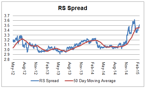 The chart below is the spread between the relative strength leaders and relative strength laggards (universe of mid and large cap stocks). When the chart is rising, relative strength leaders are performing better than relative strength laggards. As of 3/9/15: