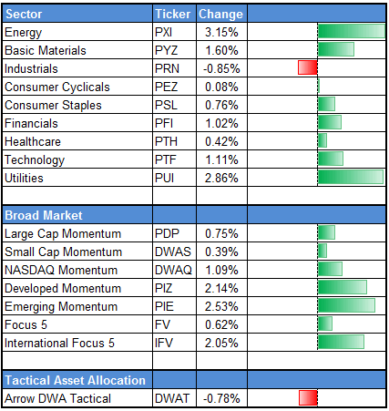 The performance above is based on pure price returns, not inclusive of dividends or all transaction costs. Past performance is not indicative of future results. Potential for profits is accompanied by possibility of loss. The relative strength strategy is NOT a guarantee. There may be times where all investments and strategies are unfavorable and depreciate in value. Nothing contained herein should be construed as an offer to sell or the solicitation of an offer to buy any security. This post does not attempt to examine all the facts and circumstances which may be relevant to any product or security mentioned herein. We are not soliciting any action based on this post. It is for the general information of readers of this blog. This post does not constitute a personal recommendation or take into account the particular investment objectives, financial situations, or needs of individual clients. Before acting on any analysis, advice or recommendation in this post, investors should consider whether the security or strategy in question is suitable for their particular circumstances and, if necessary, seek professional advice. Dorsey Wright & Associates is the index provider for the above ETFs.