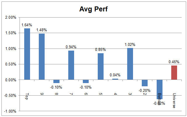 The table below shows the performance of a universe of mid and large cap U.S. equities, broken down by relative strength decile and quartile and then compared to the universe return. Those at the top of the ranks are those stocks which have the best intermediate-term relative strength. Relative strength strategies buy securities that have strong intermediate-term relative strength and hold them as long as they remain strong.