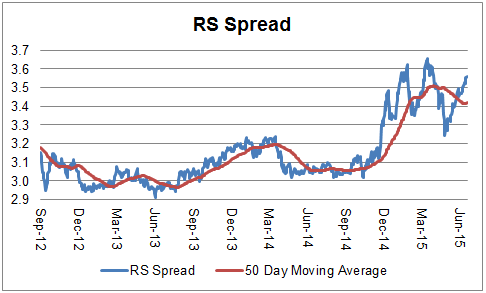 The chart below is the spread between the relative strength leaders and relative strength laggards (universe of mid and large cap stocks). When the chart is rising, relative strength leaders are performing better than relative strength laggards. As of 6/22/15: