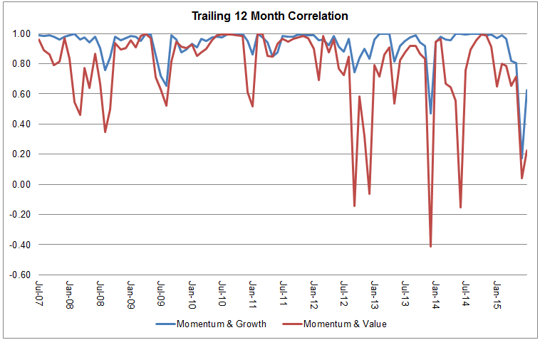 Notice how in recent years the correlation of Momentum to Value has been lower than it was in the first couple years of PDP’s history. Why is that? Because Growth stocks have generally been performing better than Value stocks in recent years so our relative strength ranking process leads us to those stocks.