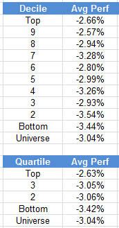 The table below shows the performance of a universe of mid and large cap U.S. equities, broken down by relative strength decile and quartile and then compared to the universe return. Those at the top of the ranks are those stocks which have the best intermediate-term relative strength. Relative strength strategies buy securities that have strong intermediate-term relative strength and hold them as long as they remain strong.