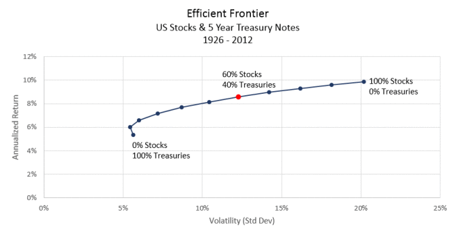 The primary task in asset allocation strategy is to determine how much of a given asset should be included in a portfolio. Various combinations of different assets can and should be considered. For instance, the historic returns and volatility of US large company stocks and Treasury Notes can be combined in various proportions and charted in the following way.