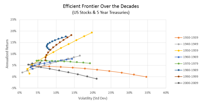 The chart above is commonly referred to as the efficient frontier. In theory it shows the maximum return that was achieved for a given level of volatility (sometimes referred to as risk). A word of caution is required when working with models such as these. It would appear to be easy to optimize a portfolio around a precise rate of return and volatility. However, the chart above was generated using historic returns data and the future is unlikely to look like the past. Rates of return, volatility and correlation coefficients can all change over time. Using past data to forecast an ideal optimal allocation for the future can be disastrous. Here’s what the efficient frontier looks like decade-by-decade.